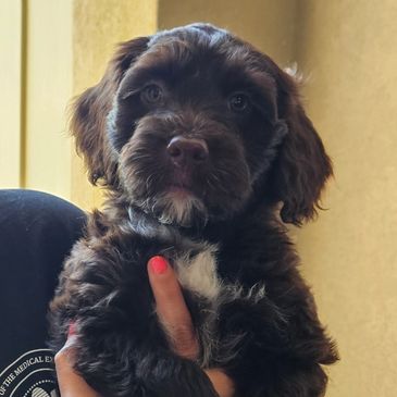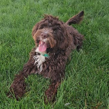 Samba has been promoted to top Nanny. She will help raise and socialize future puppies. Samba is a gorgeous Curly haired girl. She is the most loving and loyal dog. She is very caring and it really feels like she understands what we are saying. We feel she is our unofficial Emotional Support Dog and her puppies seem to inherit her ab