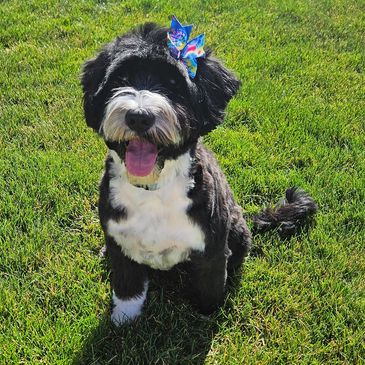 Penny is Samba's daughter (formally Jigglypuff) and a Future Mama with Utah Lake Porties! She is the sweetest puppy in the world and we are very excited to add her to our breeding program! She has such a wonderful personality and is stunning! She has silky, soft, wavy hair and is black with white markings. She also carries the gene for brown puppies. She lives with her amazing guardian family and PWD sister. She passed her DNA tests and we look forward to her puppies in 2026.